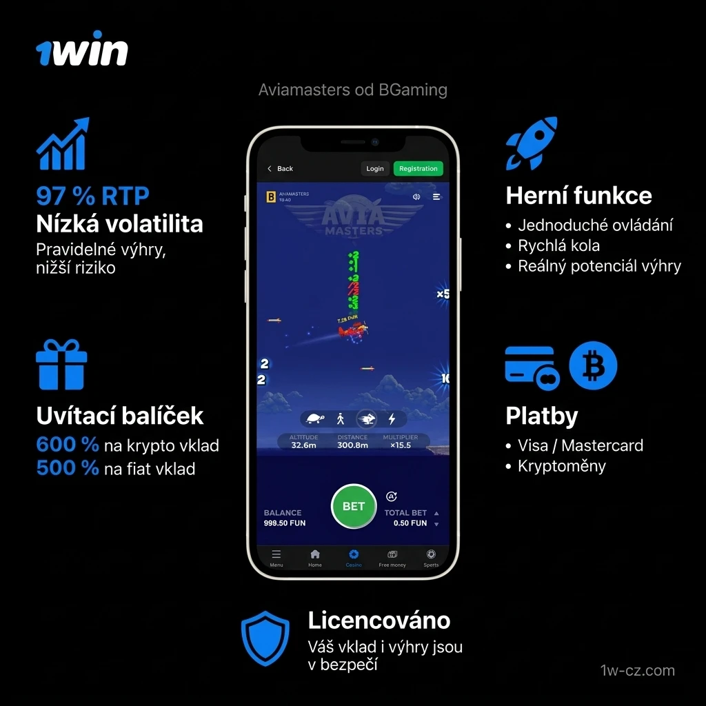 Aviamasters je letecká crash hra od BGaming s RTP 97 % a nízkou volatilitou. V České republice si ji hráči oblíbili pro jednoduché ovládání, rychlé kola a reálný potenciál výhry. Na stránkách 1win ji najdete s výhodným uvítacím balíčkem – 600 % na krypto vklad nebo 500 % na fiat vklad. Platby jsou dostupné přes Visa, Mastercard i kryptoměny. Provozovatel drží platnou licenci, takže váš vklad i výhry jsou v bezpečí.